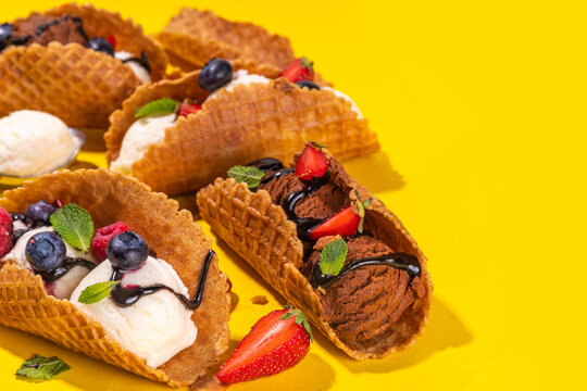 Various sweet taco ice creams. Waffle taco shells with chocolate and vanilla flavour ice cream with different fruits, berry, toppings