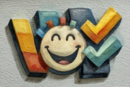 Colorful abstract illustration of a joyful smiley face alongside vibrantly illustrated check marks conveying positivity enthusiasm and success captured in a playful artistic composition