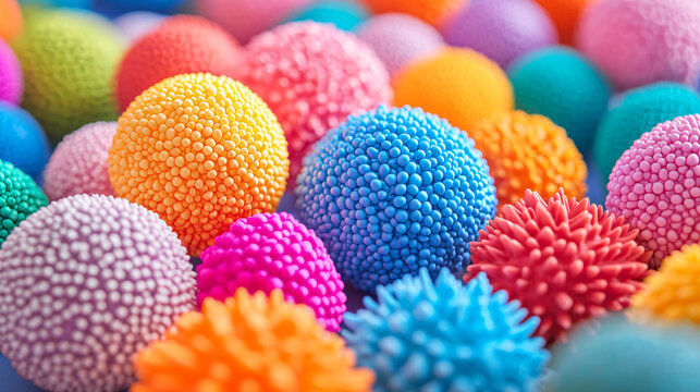 Colorful textured balls create vibrant and playful atmosphere, evoking joy and curiosity.
