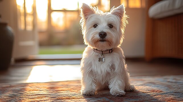 A white West Highland Terrier sits on a patterned rug in a sunlit room, looking directly at the camera.