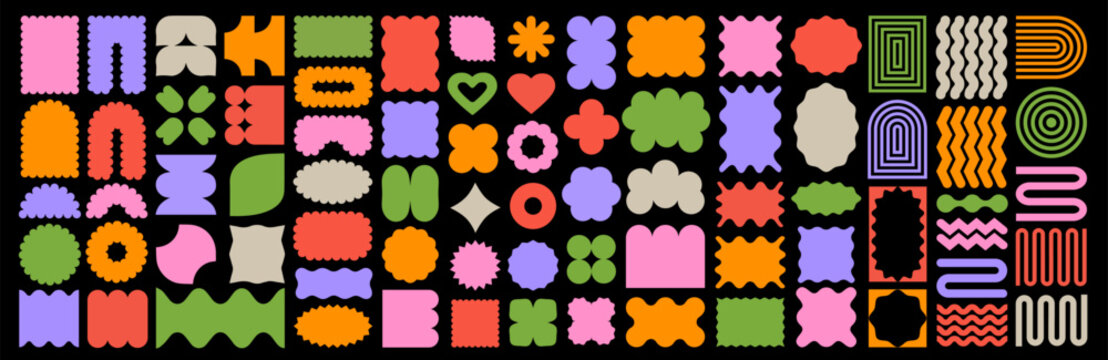 Set of colorful neon doodle sticker, blank shiny y2k label, rainbow emblem, sale badge, gradient hologram comic icon and iridescent product tag with holographic effect. Holographic pvc sticker pattern