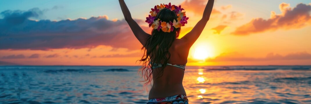 Woman in a bikini reveling in the summer sunset Hula dancer performing a classic dance Girl exhibiting lively Tahitian dance Beauty queen with a floral crown looking towards the horizon