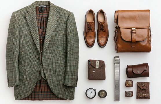 Flat lay of classic men's outfit and accessories organized neatly on white background