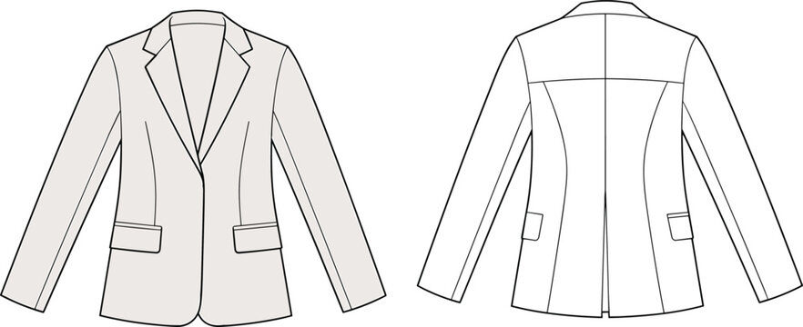 Multiple blazer front and back cad drawing flat vector illustration, women’s formal jacket sketch, two button blazer, tailored fashion design template