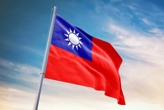 Waving flag of Taiwan in blue sky. Taiwan flag for independence day. The symbol of the state on wavy fabric.