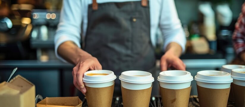 Hot coffee on the go and croissants for breakfast. Biodegradable, disposable takeaway coffee and tea cups, eco friendly alternative lifestyle