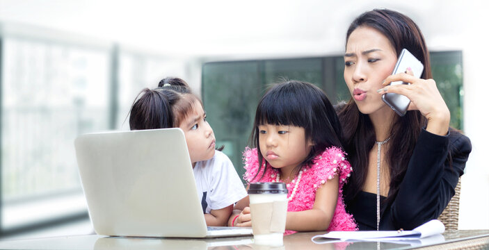 Mother is busy working and taking care of her children during the semester break. Mother is busy working and taking care of her children in summer break school to take care her family with working