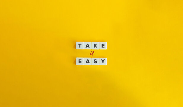 Take It Easy Phrase. Block Letter Tiles on Yellow Background. Minimalist Aesthetics.
