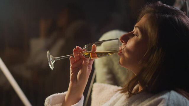 Gloomy woman lost in thoughts takes sip of light alcoholic drink. Deep gaze of woman falls on glass held in own hands but lady looks as if through beverage