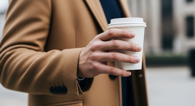 Plain white takeaway coffee cup held by man in camel coat, close-up side angle lifestyle photography for luxury urban branding