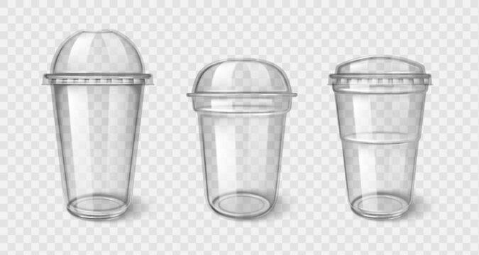 Plastic takeaway cups with transparent lid - clear disposable coffee, tea or cocktail containers. Beverage vessels with dome and flat covers for hot or cold drinks. Realistic takeaway glasses mockups