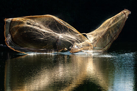 Throwing a fishing net on Nhu Y river, Hue, Vietnam. This is a river flowing through Hue city, where many Hue fishermen live. Photo taken in Hue, Vietnam in September 2022.