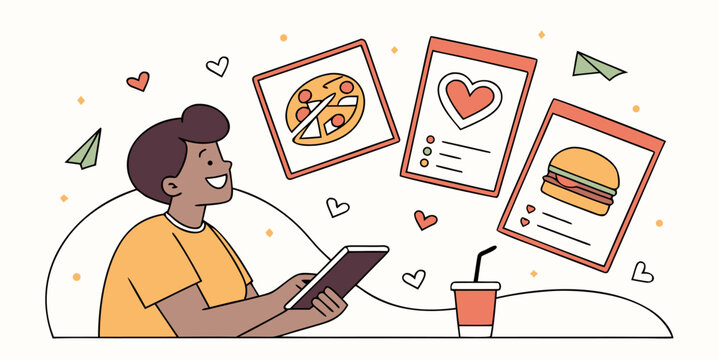 Happy person eagerly browsing delicious fast food options on a mobile device for delivery or takeout