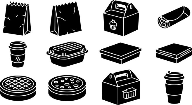 Delivery packages, cardboard boxes, containers, paper cups for takeaway food and drink. Different kind, type of carton packs for takeout snacks. Flat vector illustration isolated on white background