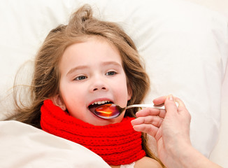 Sick little girl in bed taking medicine