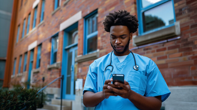 Black male nurse taking a break and checking his mobile phone