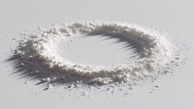 A circular arrangement of white powder on a white surface with soft shadows creating a ring shape
