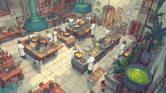 In a lively culinary space, talented chefs expertly prepare a variety of delicious meals amidst colorful ingredients and bustling energy.