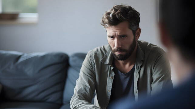 PTSD, soldier and man in therapy for trauma counseling due to military war and talking army mental health support. Consultation, depression and sad man with help for psychology problem on a sofa