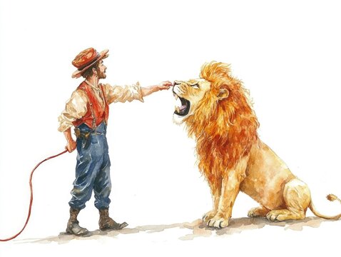 Whimsical Watercolor of a Friendly Lion Tamer Performing in a Colorful Circus Setting