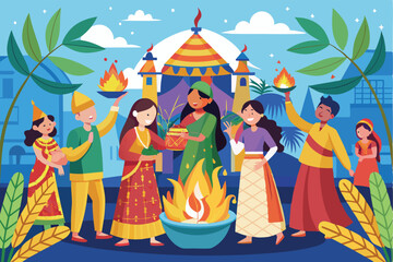 Families gather to celebrate Pongal, sharing traditional dishes and festive activities around a decorated outdoor space filled with joy and laughter.