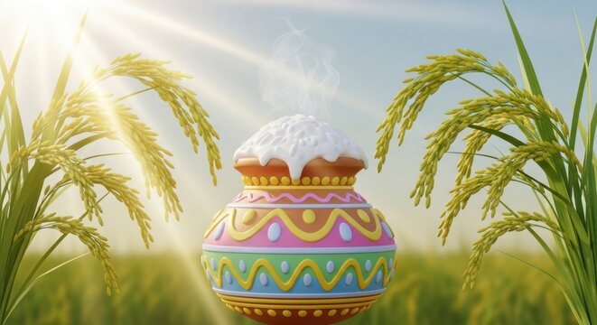 Traditional pongal pot with rice and sugar cane, celebrating the harvest festival.
