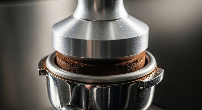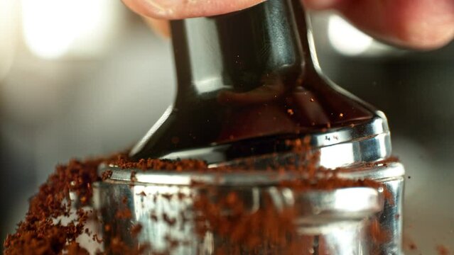 Super Slow Motion of Tamping Ground Coffee. Close-up, Macro Shot, Coffee Machine Accessories. Filmed on High Speed Cinema Camera, 1000fps.