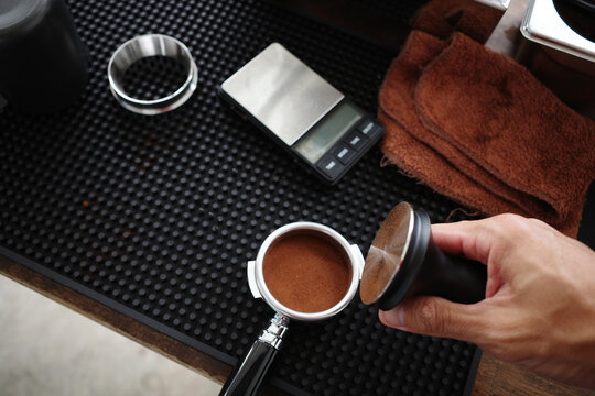 Close-up of hand Barista cafe making coffee with manual presses ground coffee using tamper on the wooden counter bar at the coffee shop