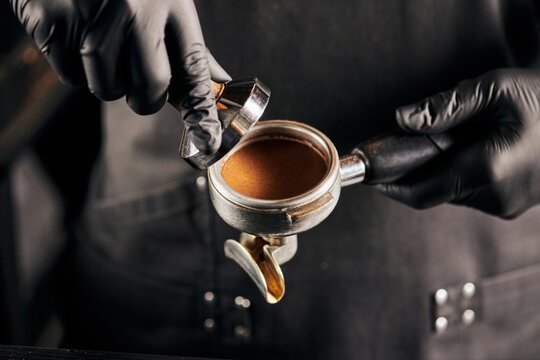 cropped view of tamper with ground coffee and portafilter in hands of barista in black gloves