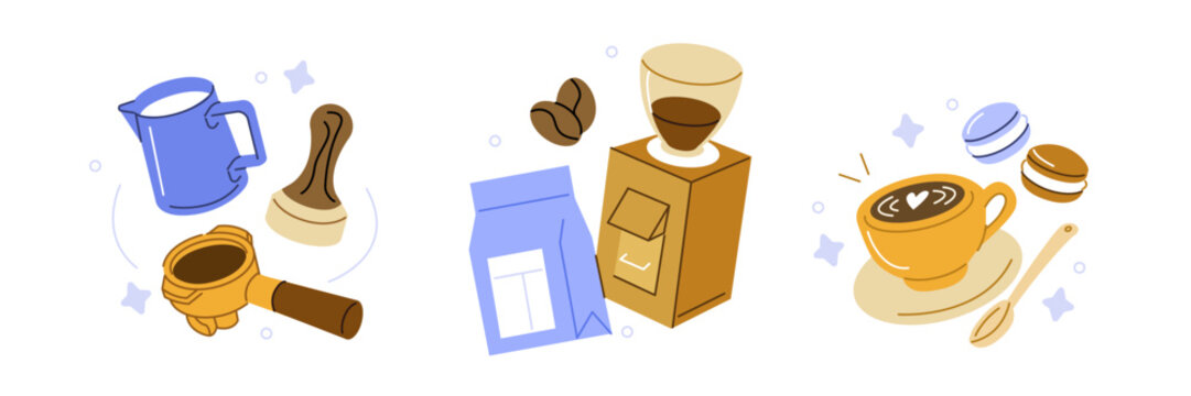 Coffee brewing equipment set. Collections of coffee grinder, portafilter, milk pitcher, tamper and other barista supplies for espresso making. Hand drawn doodle. Vector illustration.