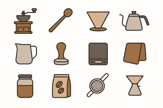 Kettle jug tamper coffee vector accessory spoon funnel grinder jar icon towel