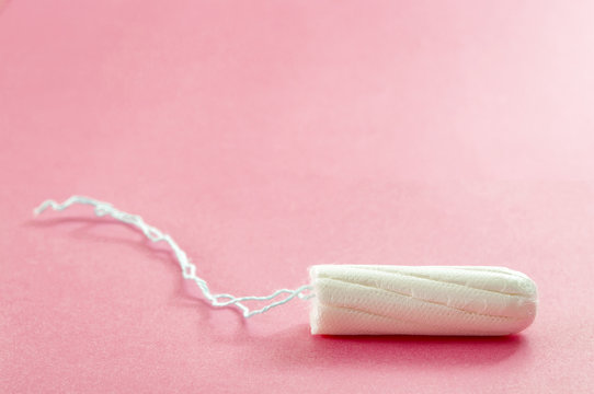 Menstrual cycle, feminine care, menstruation and intimate products concept with internal tampon isolated on pink background with copy space