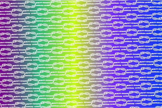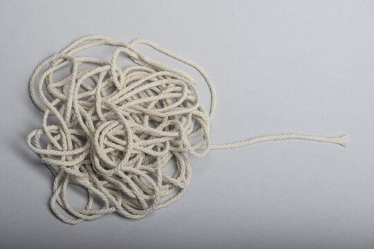 A length of white rope is tangled in an intricate knot, laying on a neutral surface