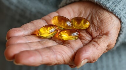 Middle-aged woman's hand holds two softgel capsules for joint health and support
