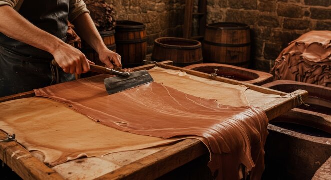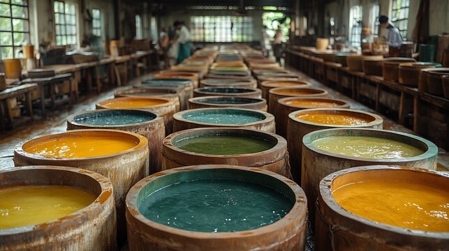 Rustic leather tannery with large vats of natural dyes hides soaking in colorful solutions and workers preparing the leather for luxury goods production