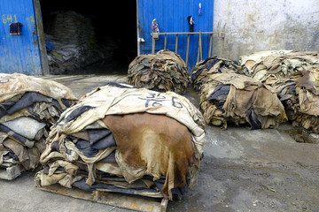 Pieces of raw leather stacked in tannery
