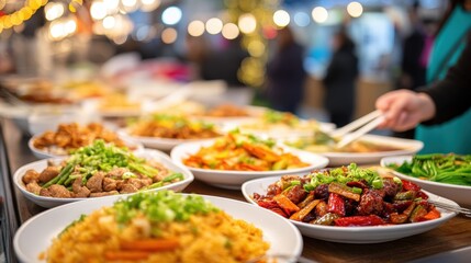 On a warm summer evening, an outdoor market comes alive, showcasing a tantalizing array of grilled meats alongside vibrant, fresh vegetables