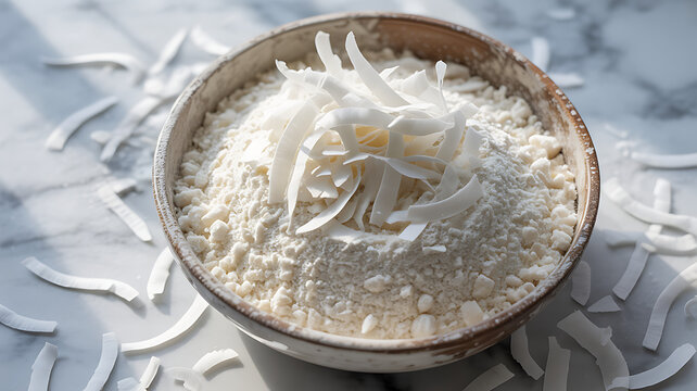 Delicious coconut flour ready for baking tantalizing treats, topped with delicate flakes, inviting culinary exploration and delightful culinary possibilities, inspiring baking