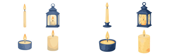 Holiday Candle Icons. Outline icon set of lighting candles at a holiday table: taper candle, matchstick,