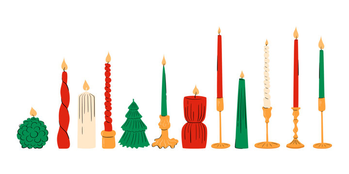 Elegant holiday candle collection. Festive taper candles and Christmas decorative candles. A large, cozy candle collection. Home decor items.