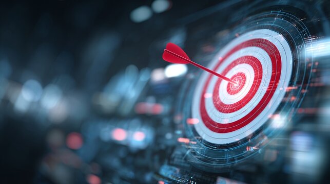 Precision target with an arrow hitting the bullseye, symbolizing achievement and accuracy against a blurred background with digital overlays.