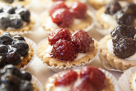 White pink meringue with blueberries, chocolate tartles with raspberries, other desserts on shelf in candy store. Close-up