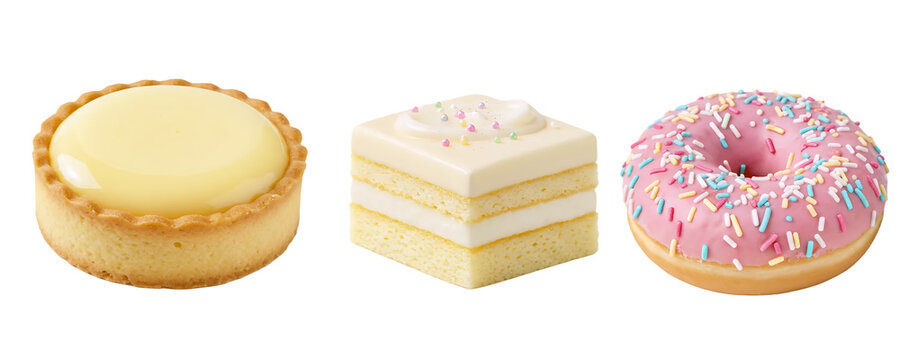 A classic bakery dessert set with a slice of lemon tart, a layered cake slice, and a pink-frosted donut. This delicious collection offers a variety of popular sweet treats.