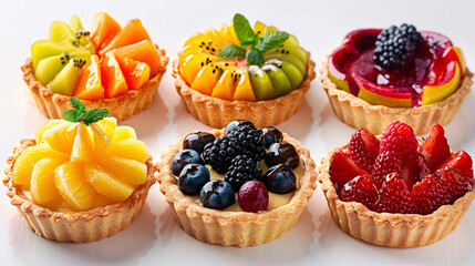 Delicate mini tarts with fresh berries and creamy swirls on a sleek stone slab, perfect for an elegant gathering