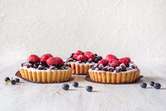 Assorted mini cupcakes and fruit tarts featuring strawberries, nuts, and blueberries arranged on a wooden table. Top-down perspective, detailed view