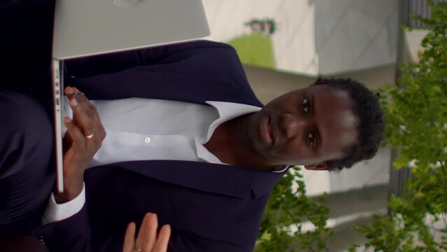 Vertical portrait business man and woman talking. Using laptop with artificial intelligence, businesspeople engages in remote work, handling tasks and responsibilities from location with internet.