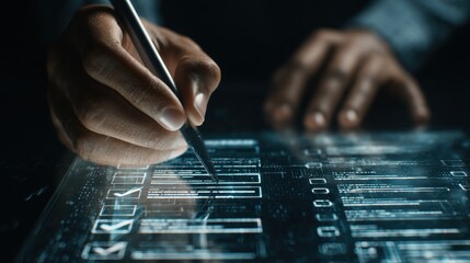 Businessman s hand touching a digital interface displaying a checklist with a verified checkmark and document icons representing approval and compliance