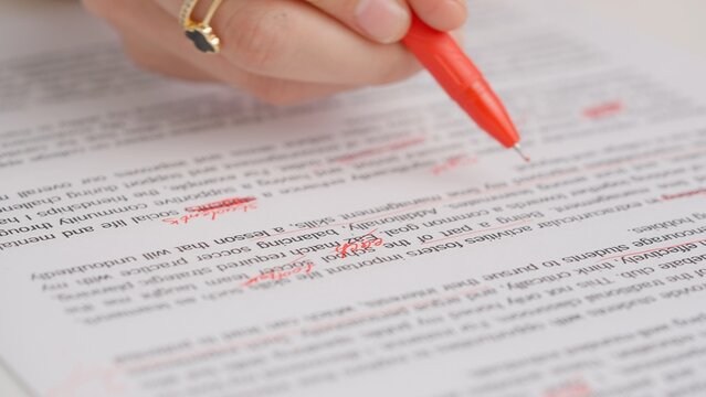 Teacher correcting an exam or homework with a red marker pointing out all the errors in the text.