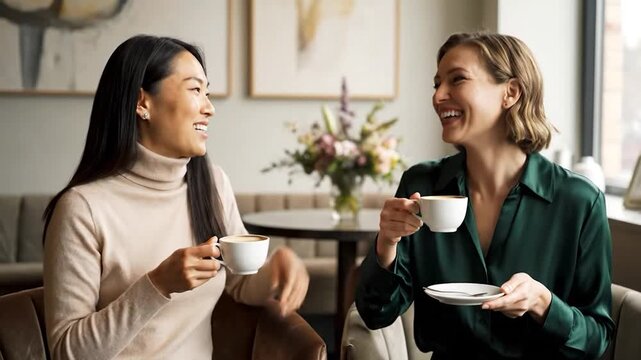Two women enjoying coffee and conversation in a tasteful cafe