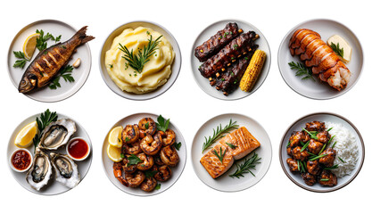 set top view white plate with dishes and cuisine, fried whole fish with garlic, herbs, oysters, lobster, grilled shrimp, mashed potatoes, ribs, chicken isolated on transparent